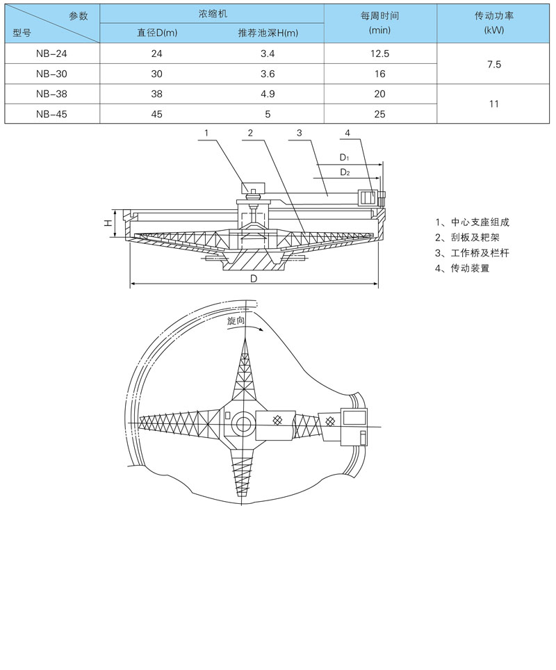 NB型周边传动浓缩机与其它浓缩机的传动原理基本雷同。属于重型类浓缩机,主要用于钢厂大型湿式选矿作业中精、尾矿浆的浓缩;也用于煤炭、化工、建材和其它水处理工业中比重大、沉降速度快的含固料浆的浓缩。 其传动采用周边滚轮,传递力矩大,完全满足池径在Φ24-45m范围内浓缩池的需要。