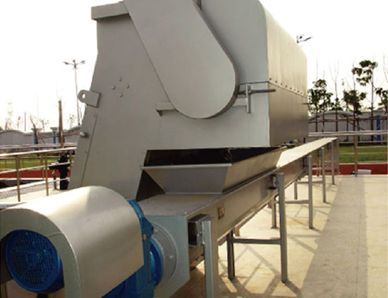 该设备采用连续式槽形带式,物料由格栅或脱水机卸料口落入输送带上,在电动滚筒的驱动下,物料从一端移动到另一端,末端与垃圾桶相衔接,再另行处理。