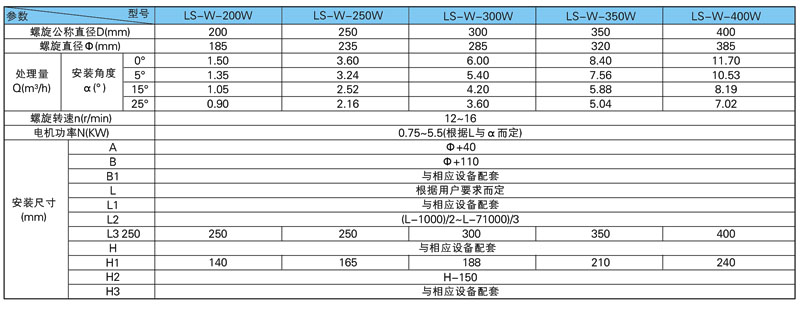 LS-W型无轴螺旋输送机适用于城镇污水处理厂、住宅小区污水预处理装置、市政雨/污水泵站及自来水厂等的栅渣处理,它主要与格栅或脱水机等设备配套使用,将栅渣或脱水污泥进行输送。