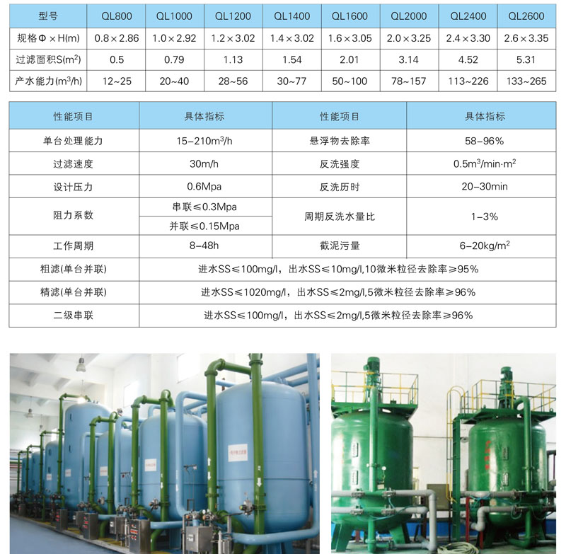 QL型高效纤维球过滤器系列产品为钢制圆形罐体,采用压力式过滤,以纤维球为滤料。本产品具有过滤速度高、处理量大、处理效果好、占地面积少等优点。适用于各种行业废水生物处理后的直接过滤、废水回用、深度废水预处理、工业给水及游泳池循环水处理。在进水SS不大于80mg/L时可保证出水SS小于5mg/L。
