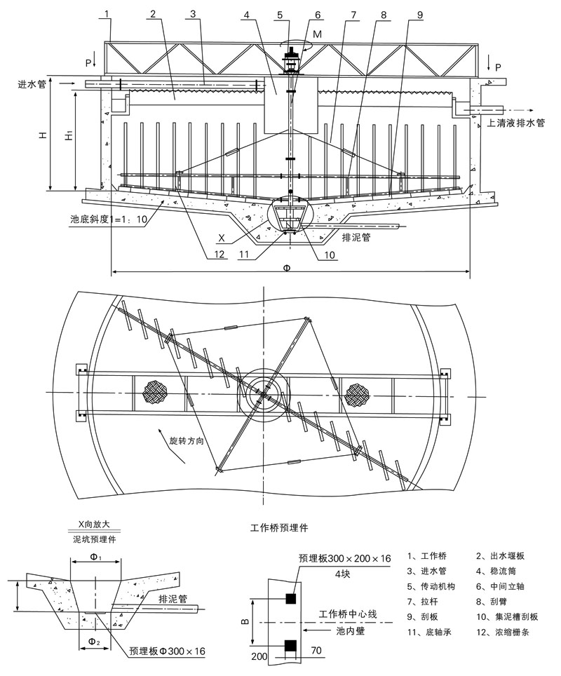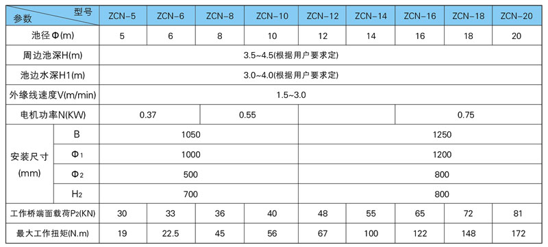 工作桥采用全桥式,其材质可采用碳钢、不锈钢或混凝土结构; 驱动装置采用立式三级摆线针轮减速机或由斜齿轮减速机与蜗轮减速机组合,保证输出扭矩及转速;