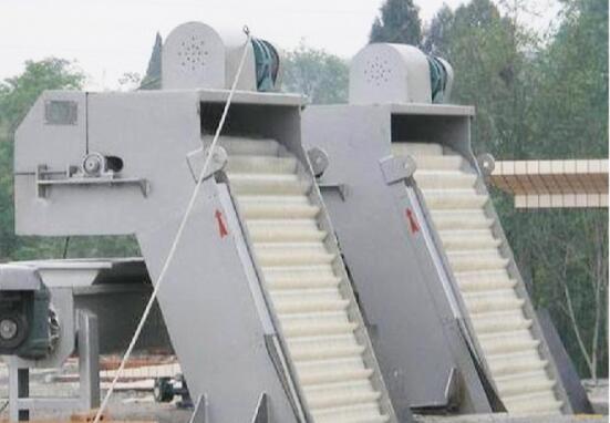 该设备采用回转式,由一种特殊形状的犁形耙齿按一定的装配顺序的数量排列在横轴上,组成耙齿链,根据过水流量,装配成不同的间隙,安装在泵站或水处理系统的入口处,当驱动装置带动耙齿链自下向上运动时,水中的杂物被耙齿链捞起,液体则在栅隙中流过,设备转动到上部顶点后,耙齿链改变运行方向,由上向下运动,物料依靠自重从耙齿上自行脱落,当耙齿从反面转到设备底部时,又开始另一循环往复的连续运行,从而不断的从水中清捞杂物,达到固液分离的目的。