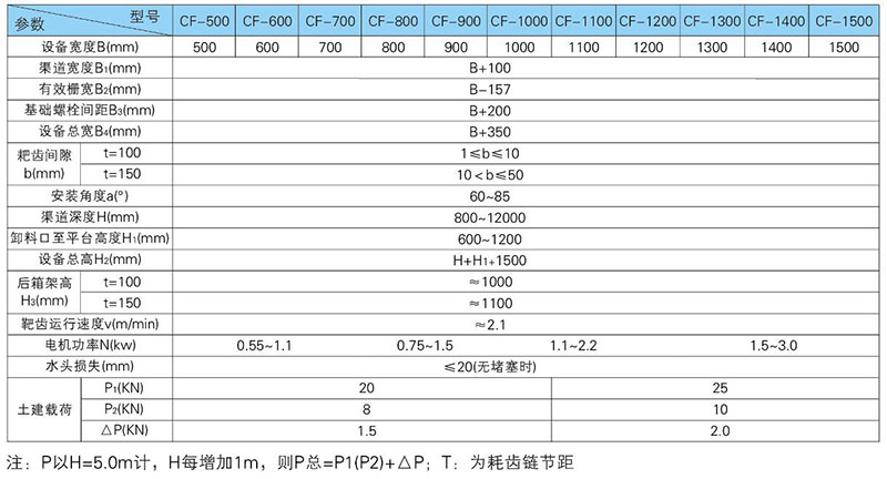 耙齿规格两种,粗格栅耙齿节距t=150mm耙齿节距,细格栅耙齿节距t=100mm;