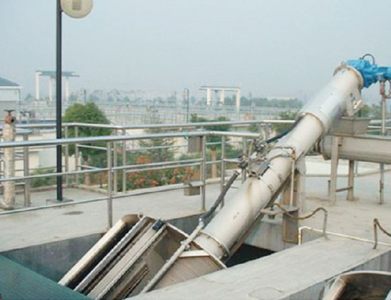 该设备由一系列圆环栅片组成的圆形楔筐作为栅面,与水平面成35°安装在水渠中,当污水从格栅端头流入栅筐内,大干栅隙的滤渣被拦截,沉积在栅筐内表面,齿形刮板由电机驱动旋转,将滤渣刮至栅筐上方靠重力落下,同时电机反转,带动齿形刮板倒转,并通过清渣板将截留的滤渣落入集渣槽里,滤渣通过中心螺旋输送、挤压、脱水后,由卸料口落入物料箱或输送机进行外运处理。