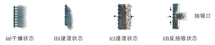 纤维转盘过滤机的过滤介质是纤维毛滤布,它的主要成分是有机纤维堆,其绒毛表面由50%超细聚酯纤维和50%改性丙烯晴纤维堆组成,同时以聚酯纤维作为支撑体。在干燥状态下,纤维毛呈直立状态,浸湿后纤维毛便会耷拉下来,形成滤布介质有3-5mm的有效过滤深度,且当量孔径只有10μm,可以使固体粒子在有效过滤厚度中与过滤介质充分接触,将超过尺寸的粒子俘获。滤布的深度能够存储俘获的粒子,减小反冲洗流量,同时还可以减少正常运行时的水头损失。在反冲洗状态下,与反抽装置相靠近的纤维毛又会直立起来,方便纤维毛中的杂质排出,可以彻底清洗。