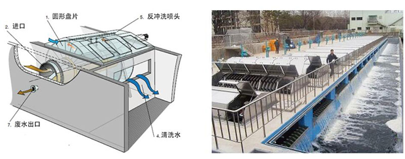 纤维转盘滤池结构由用于支撑滤布的垂直安装于中央集水管的平行过滤转盘串联起来组成。一套装置过滤转盘数量一般为2-20个,每个过滤转盘是由6个小块扇形组合而成。过滤转盘由防腐材料组成,每片过滤转盘外包有纤维毛滤布。反冲洗装置反抽吸装置及阀门组成。排泥装置由排泥管、排泥泵及阀门组成,排泥泵与反洗水泵为同一泵。